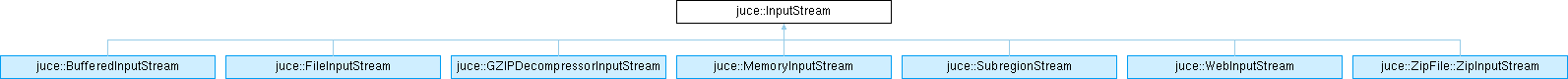 Implemented in juce::FileInputStream, juce::ZipFile::ZipInputStream, juce::WebInputStream, juce::BufferedInputStream, juce::MemoryInputStream, juce::SubregionStream, and juce::GZIPDecompressorInputStream.